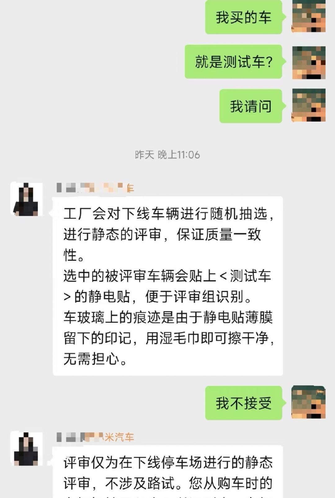 随后,车主立马与小米的售后工作人员进行沟通,得到的解释是工厂会对下线车辆进行随机抽选,进行静态的评审,保证质量一致性。