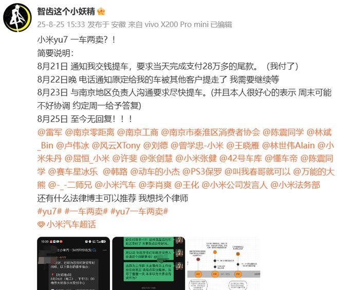 随后他多次与南京地区负责人沟通,要求尽快提车,但截至8月25日,仍未收到任何回复。