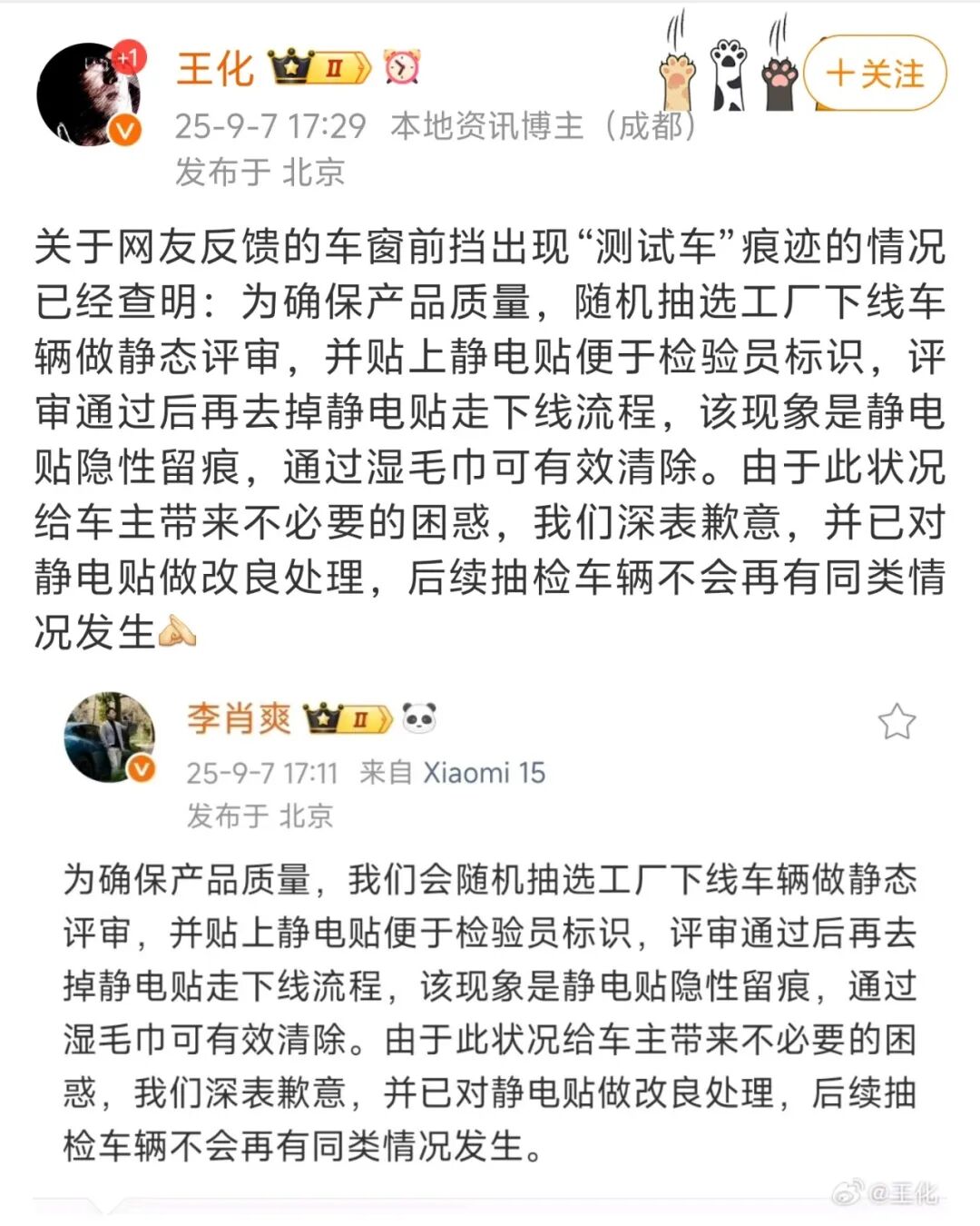 随着事件在网上迅速发酵,小米汽车副总裁李肖爽公关部总经理王化先后在微博上对此公开回应。