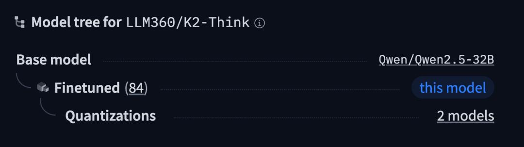 因为从HuggingFace中的Model tree来看,K2 Think是基于Qwen 2.5-32B打造的: