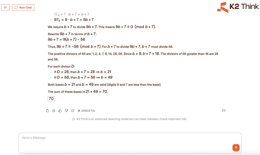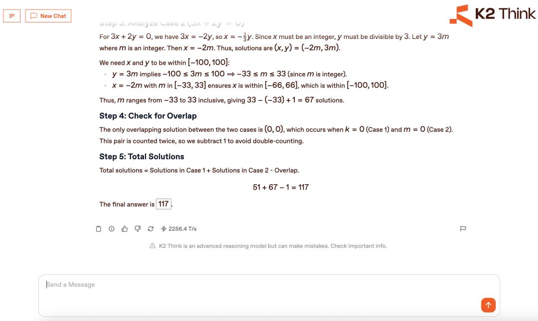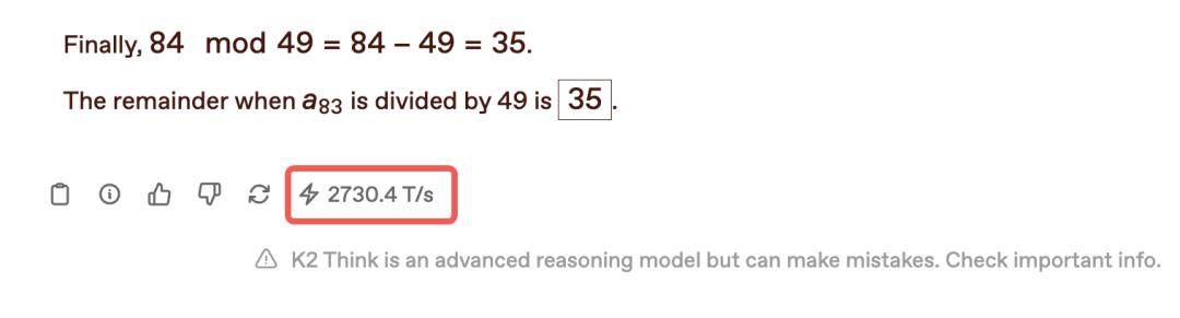 可以肉眼看到,在没有任何加速的情况下,K2 Think在思考过后输出答案的速度,真的就是“啪的一下”。