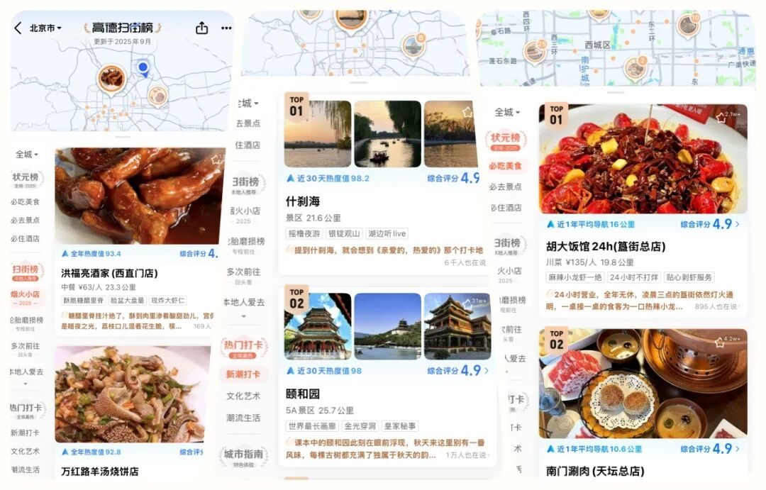 高德推出了一个新榜单——「高德扫街榜」,分为美食、酒店、景区三类,它号称是“全球第一个完全基于用户真实行为产生的榜单”,不搞打分,而是聚焦导航到店的人数、复购率、专程前往、人群宽度,榜单维度纳入“轮胎磨损榜”、“本地人爱去”“多次前往”“烟火小店”等。“美食目前是最核心的内容板块”,高德地图产品经理、高德扫街榜产品负责人李刚说李刚对外表示。