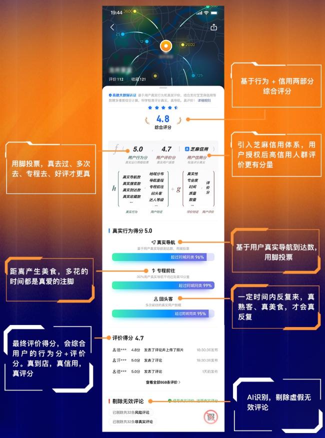高德多次强调真实,扫街榜敢完全抛弃商业化,也因为这个榜单是的数据驱动的产品。用户使用高德时,导航、搜索、到达的行为数据是真实的;用户的反馈数据,包括评论本身的专业度、时间、质量等也都有据可循。为辅助两个算法因子,高德引入了芝麻信用体系,“用户导航到店后的评价、芝麻信用高的人评价权重都会更高。”,同时借助通义大模型的AI算法,使得榜单更好地理解数据。比如AI风控会自动识别虚假评价和异常流量,避免商家刷榜;AI推荐还会根据用户出行习惯,把榜单和好店精准推荐到首页和导航语音里。
