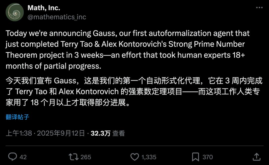 参考链接:[1]https://x.com/mathematics_inc/status/1966194751847461309[2]https://www.math.inc/gauss[3]https://www.math.inc/vision