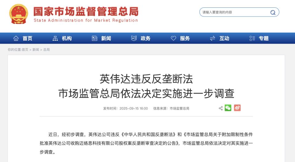 9月15日,市场监管总局发文称英伟达公司违反反垄断法,依法决定对其实施进一步调查。