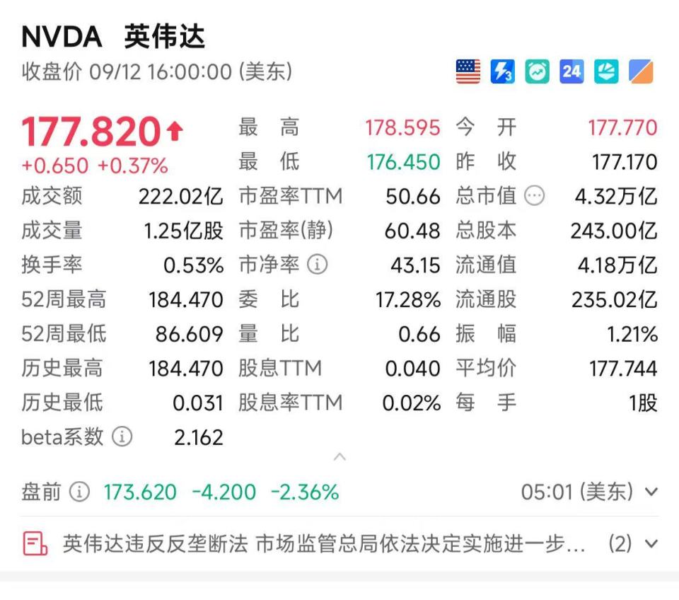 受该消息影响,英伟达美股周一盘前跌超2%。