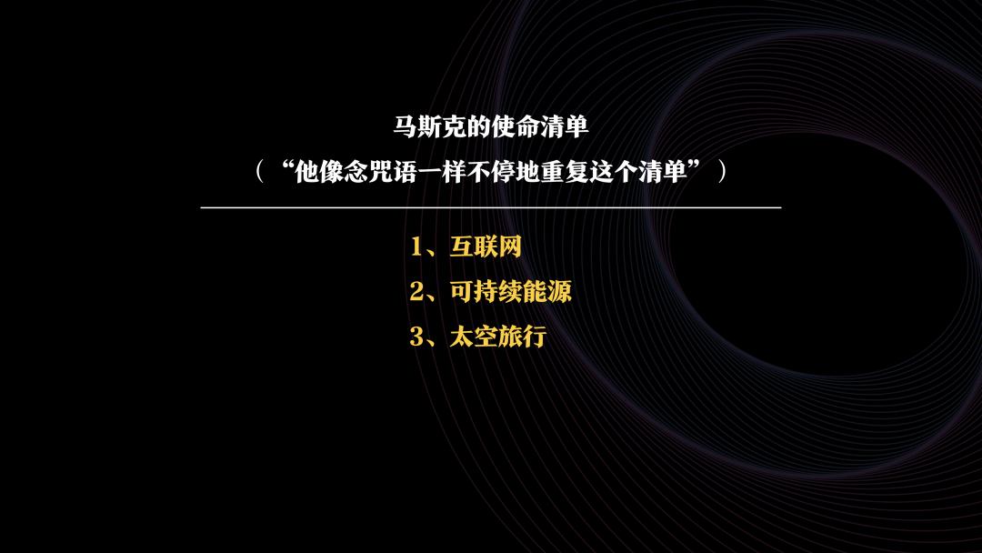 马斯克的新理念是超越商业,从生命尺度思考使命。他早期创业套现巨额财富后,回想起大学时改变人类未来的梦想,从“小我”走向“大我”。此外,他说过的一句话经常让我热泪盈眶:“对我而言,让人类成为跨行星的物种,这是我赚钱积累财富的唯一目的。除此以外,金钱对我没有任何意义。”