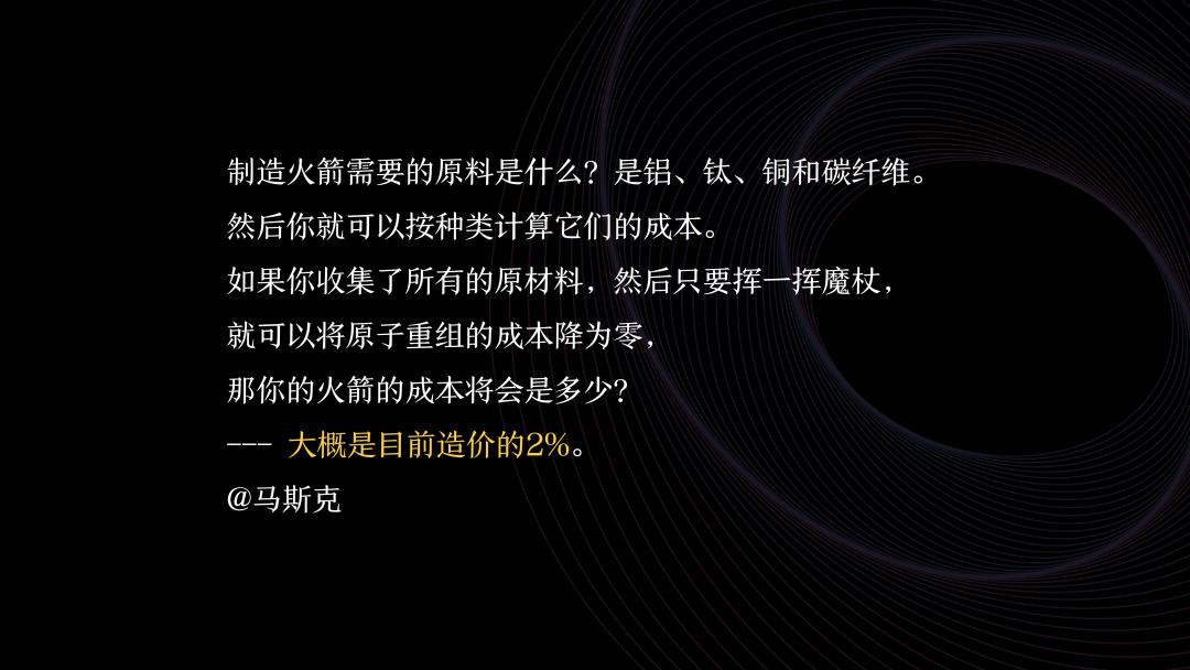 然而,最大的挑战来了:火箭成本高昂,通常是一次性的。如果能重复使用1000次,成本的“白痴指数”将降至千分之一。这是降低成本的关键,如果解决不了,前面的努力都将白费。