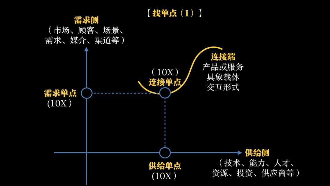 我会建议大家从三个方向来找单点。第一,在需求侧是否存在一个十倍速变化的单一要素;第二,在供给侧是否存在一个十倍速变化的单一要素;第三,在连接端是否存在一个十倍速变化的单一要素。然后,这三个十倍速变化的单一要素能否整合成一个系统。