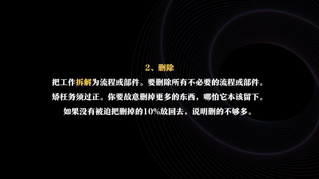 质疑完之后,第二步是删掉。就像在工程里删掉多余的部件和流程一样,我们也要删掉大量不必要解决的问题。可能你只需要解一道题,但你面对的却是100道题。你要删掉99道,只解那道你该解的题。大家回忆一下做过的事情,可能十件中有九件是不该做的。我们把有限的精力用在了那些不该做的事情上。