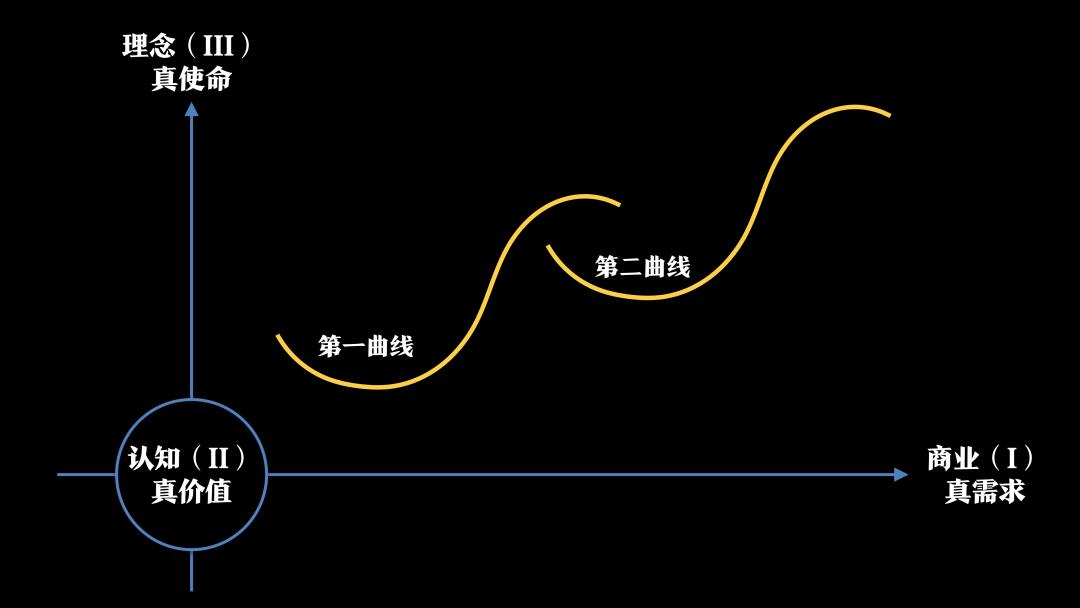 如果用图来表达这三种力量,可以用两个轴:X轴代表商业,关键在于“真需求”。第二阶是认知的力量,带来“真价值”,即我的基因。Y轴代表一种超越我的力量,通过我发挥作用。加上“三”,代表真正的使命,是天命、calling。使命是我自己想出来的,而calling是上天赋予的,能对我的体系产生力量。