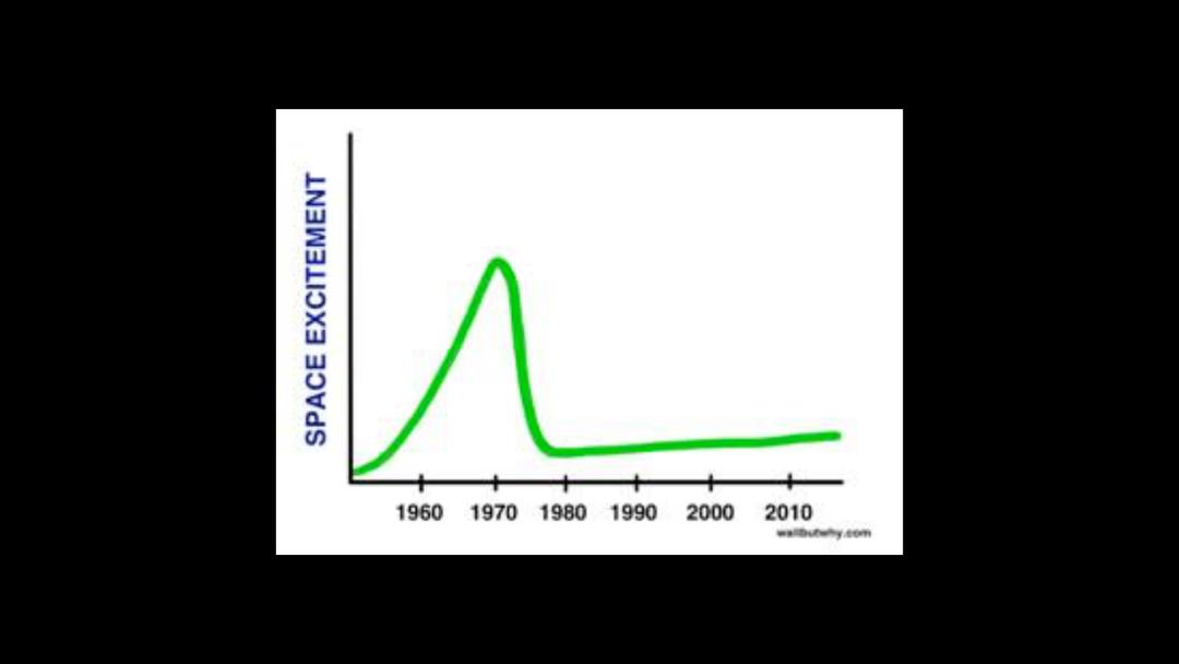 我给大家看两张图。第一张图是人类太空探索的历程图,最高点出现在1970年左右。那一年发生了什么?阿波罗登月。阿姆斯特朗说了一句著名的话:“这是我的一小步,却是人类的一大步。”但你会发现后来太空探索的热情逐渐消退了。因为美国人进行阿波罗登月,只是美苏之间的一场军备竞赛。当这个任务完成之后,人类对太空探索的热情、好奇心、雄心壮志都消失了。于是,太空探索的曲线开始下降,一直持续到2010年。