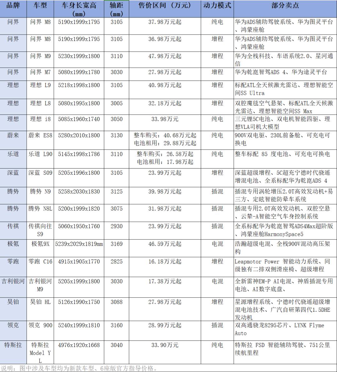 消费者的多样化需求,推动着大六座SUV车型市场的供给不断丰富。根据时代周报记者统计,目前新能源汽车市场上的主流大六座SUV车型,已经覆盖了纯电、增程、插混等不同动力模式,价格区间更是从15万元到50万元不等。