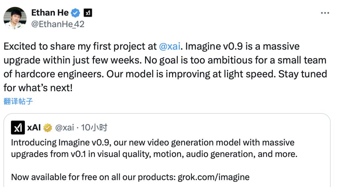 xAI并没有放出完整的技术博客,只是提到Imagine v0.9相比初代版本在视觉质量、动作、音频生成方面有所升级,并上传了几个生成视频案例。