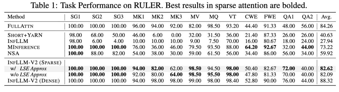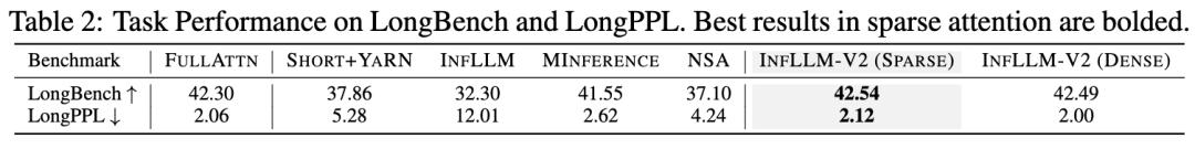 在长文本理解任务RULER、LongBench与LongPPL评测中,InfLLM-V2实现了与稠密注意力模型完全可比的性能,展现了InfLLM-V2的优越性。其他稀疏注意力方法一定程度上都会导致模型性能下降。