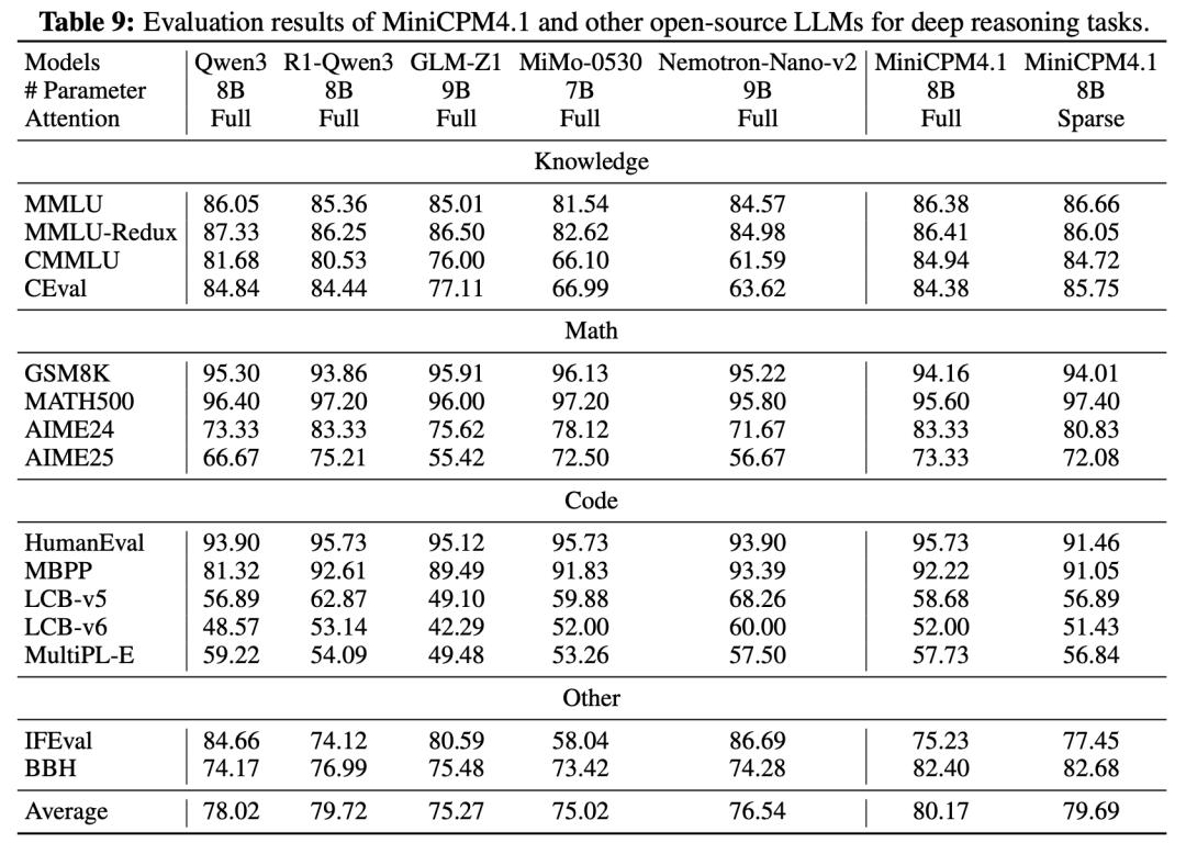 MiniCPM4.1在众多深思考任务上取得综合平均分同尺寸模型第一。