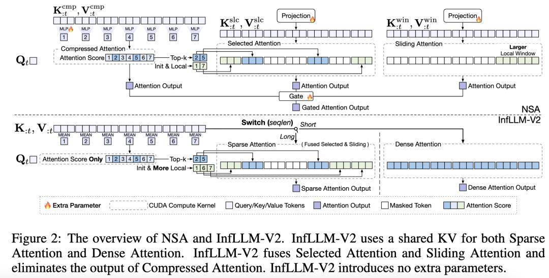 NSA虽然采用了成熟的块稀疏结构并配套专用CUDA内核,但其架构与主流的「短序列预训练—长序列微调」范式存在明显错配:引入三套独立的 KV 缓存与三种注意力分支,在「长序列微调」中将使得模型收敛不稳,并且对短序列场景增加了大量的额外开销。