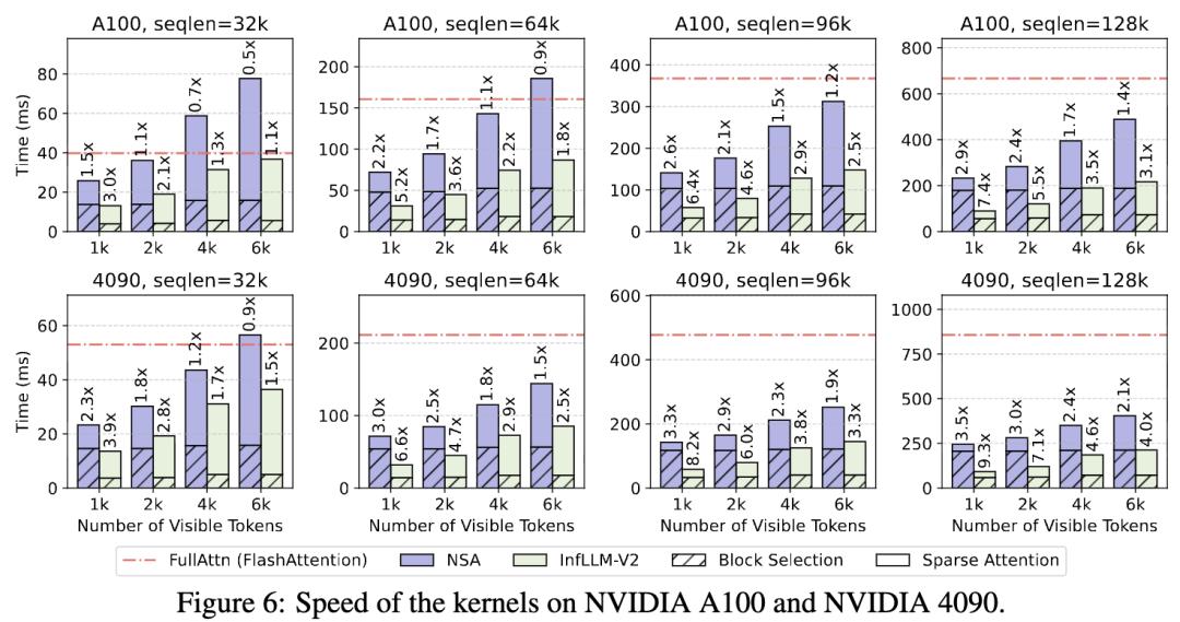 研究人员在A100与4090两款芯片上对InfLLM-V2进行了推理效率评测。