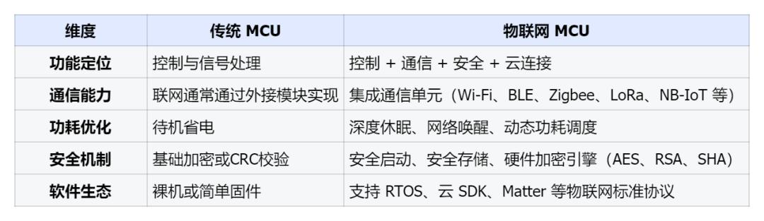 物联网 MCU 与传统 MCU 的差别,不仅仅是加了一个“Wi-Fi”或“BLE”模块,而是理念与生态的全面升级。