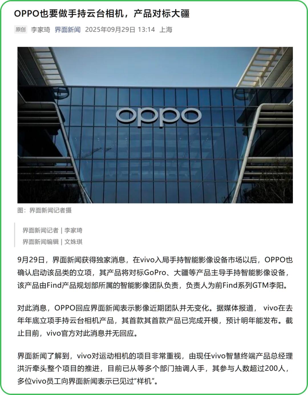 而短期看更具威胁的,是来自手机行业的跨界打击。OPPO、vivo等年营收数千亿的庞然大物,已公开宣布立项手持智能影像设备,计划于2026年发布产品。