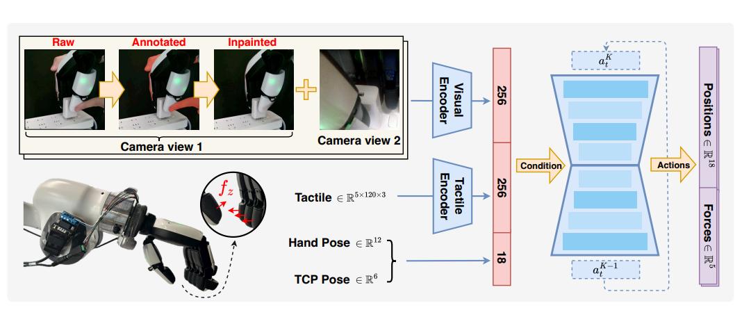 最后,学习得到的策略接收视觉与触觉信息输入,预测关节位置与接触力,并通过力控执行以实现鲁棒操作。