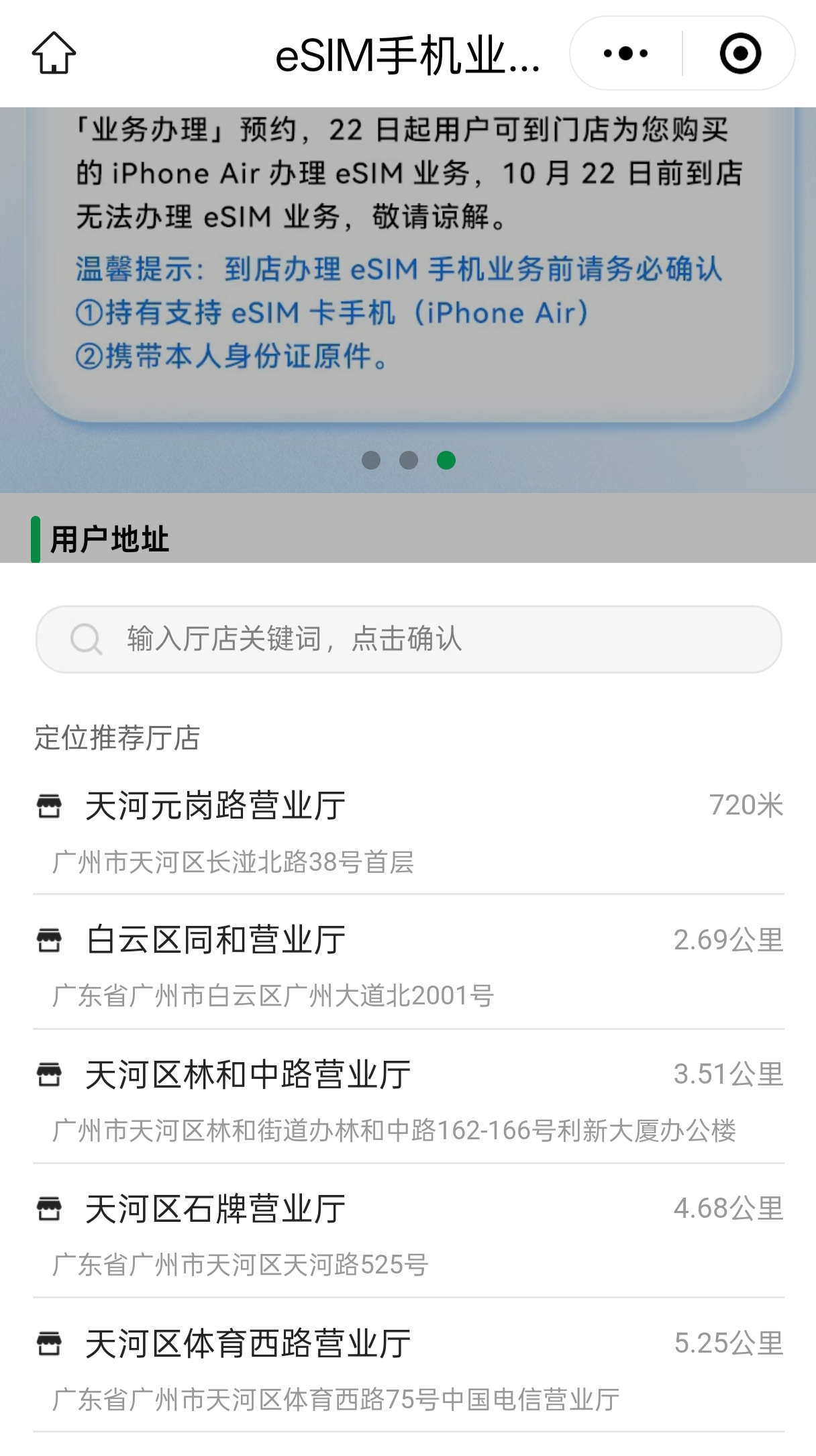 而从覆盖范围来看,中国电信宣布在全国 31 个省市正式上线,中国移动则指出「全面上线」,中国联通虽未在公告中明确,但从预约页面来看 ,三家都支持了全国大部分线下营业厅。以小雷所在地为例。附近中国电信营业厅基本都支持 eSIM 手机业务办理。