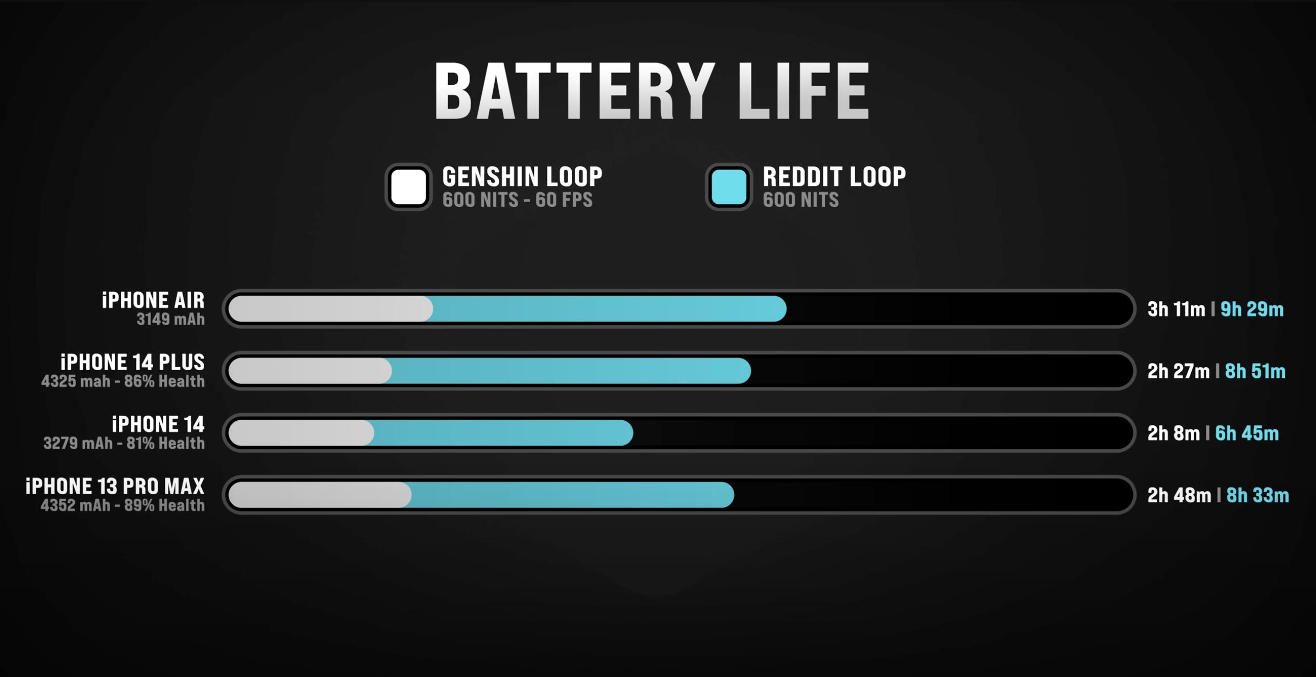 按照苹果在官网的标称,iPhone Air 支持最长 27 小时本地视频播放和 22 小时的流媒体视频播放。而在 Youtube 博主 Dave2D 的测试中,iPhone Air 在 600nit 亮度下玩《原神》大约能持续 3 小时 11 分钟,在使用 Reddit 等应用的日常场景中,续航可达 9.5 小时。