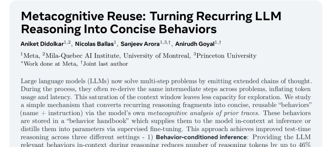 这篇论文名为《Metacognitive Reuse: Turning Recurring LLM Reasoning Into Concise Behaviors》,发表于 2025 年 9 月 17 日,来自 Meta 团队与普林斯顿大学、蒙特利尔大学联合研究。