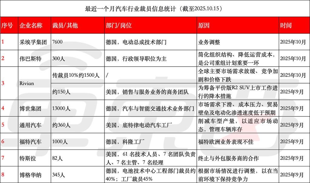 车东西10月15日消息,今年三季度,全球汽车行业正经历着一场刺骨的寒流,从德国零部件巨头到美国顶尖汽车集团,再到新能源车企新贵,一波接一波的裁员浪潮正在席卷汽车行业。