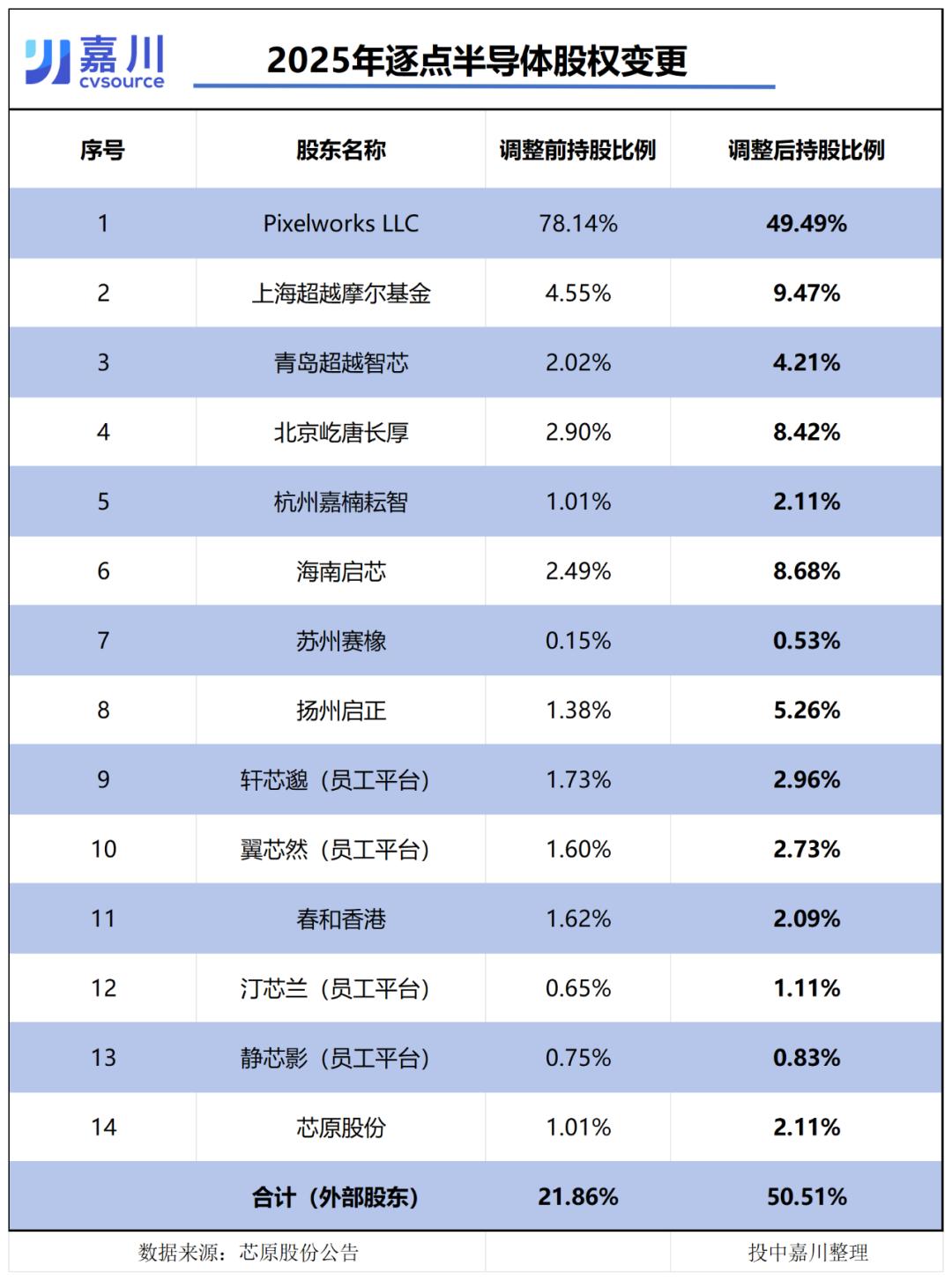 具体而言,Pixelworks持股比例从78.14%调整至49.49%。而外部股东的整体持股比例从21.86%提高到了50.51%(见下表)。