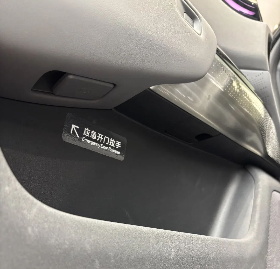 华为与奇瑞合作的智界R7、S7车型,内侧机械应急把手同样设置在窗户升降按钮旁,虽未张贴醒目标识,但实际操作时可轻松拉起。极氪7X等车型则在门外把手下方预留机械钥匙孔,在极端断电场景下能实现手动解锁,同时车门内侧置物箱上方配置了“一键破窗”拉绳,为逃生开辟新路径。
