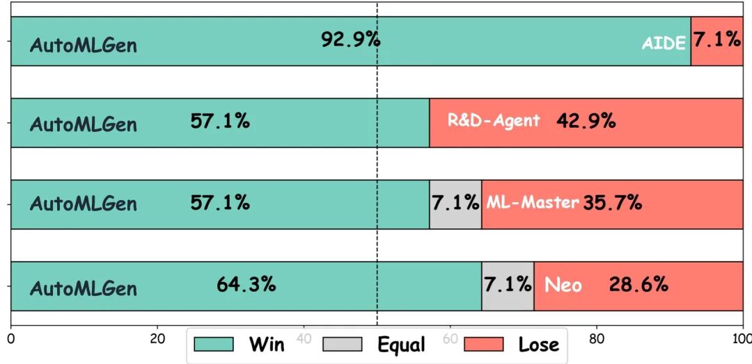 在更轻量的MLE-Bench-Lite测试中,AutoMLGen依然领先,以显著优势超越现有方法,体现出一致的性能与出色的泛化能力。