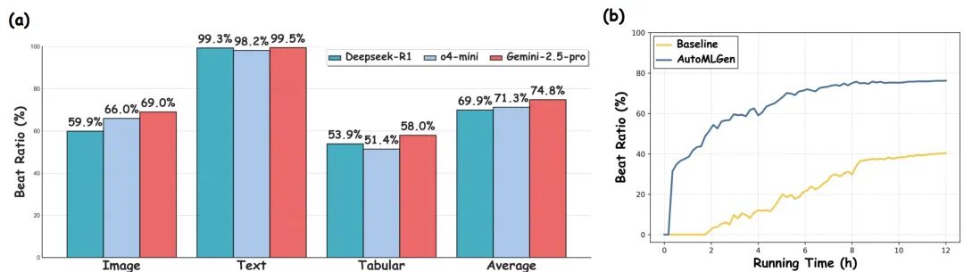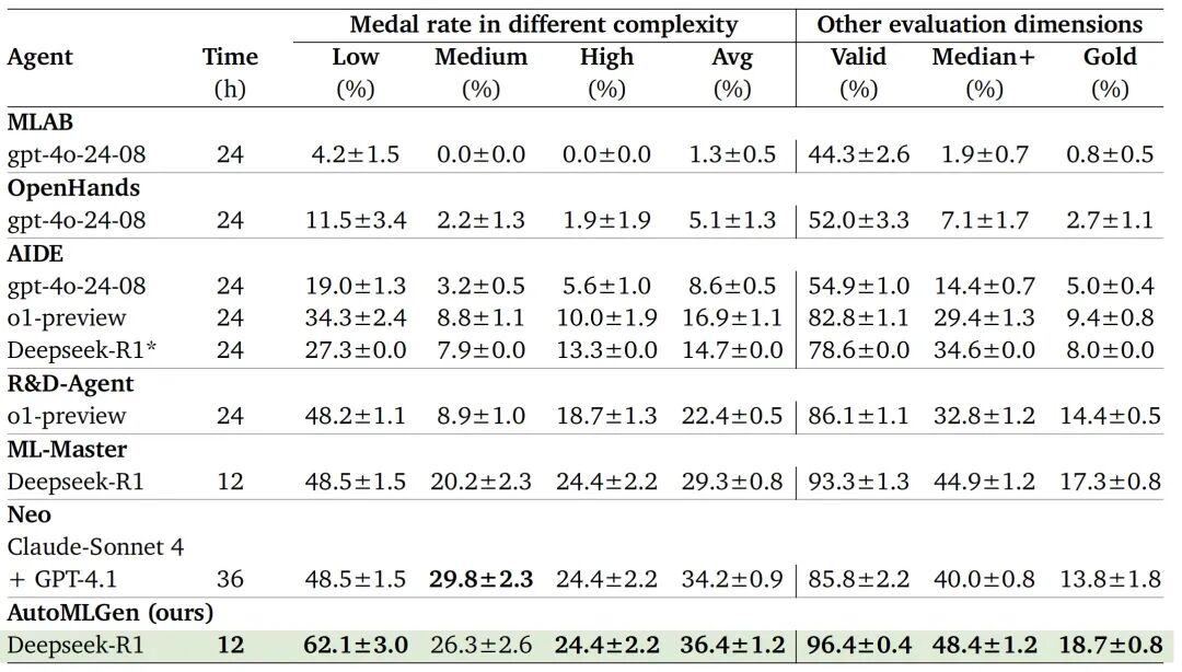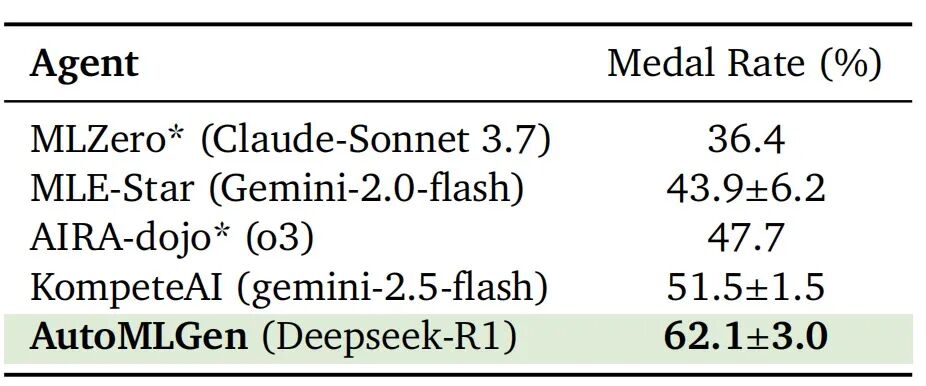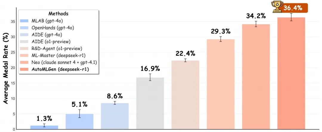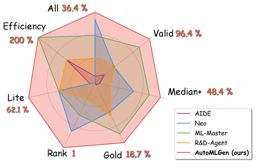 AutoMLGen在仅使用DeepSeek-R1模型的情况下,以36.4%的平均奖牌率和18.7%的金牌率登顶MLE-Bench榜单,用标准时长一半(12小时)的计算预算实现“更准、更快、更省”,体现了AI智能体从“代码生成”到“算法优化”能力的转变。