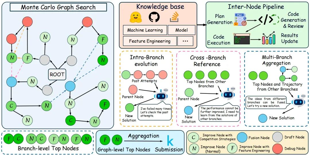 AutoMLGen创新性地提出了蒙特卡洛图搜索,在搜索过程中引入图结构,让不同分支的节点和轨迹能够动态融合与共享,实现真正意义上的“经验互通”。