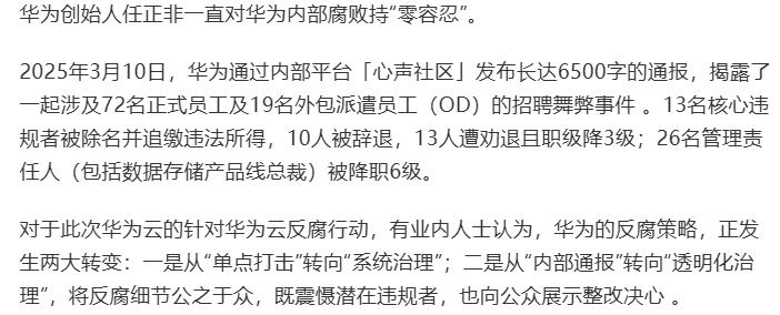 华为创始人任正非对内部腐败一直持“零容忍”态度。据《财联社》等报道,2025年3月10日,华为通过内部平台“心声社区”通报了一起涉及72名正式员工和19名外包员工的招聘舞弊事件。此次对云计算高管的问责,是这一治理逻辑的延续和强化。
