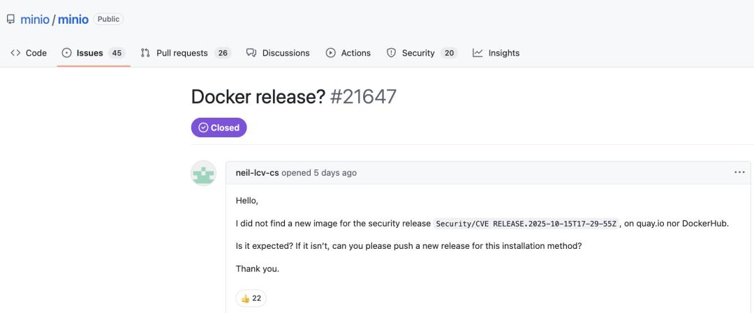 曾被视为全球增长最快的对象存储开源系统、下载量超过 10 亿次的 MinIO,最近在开源社区掀起了一场不小的风波。事情的起因是:MinIO 于 2025 年 10 月 15 日发布了针对安全漏洞的 CVE 合规版本,但部分用户在 DockerHub 和 Quay.io 上却找不到官方镜像,只能在 GitHub 上提问:“新镜像去哪了?”