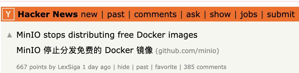事实上,Hacker News 上,也有网友透露,其实 MinIO 此举早有前兆,“文档几周前就被弃用了,现在连 Docker 镜像也不更新,开源项目可能要停滞了。”