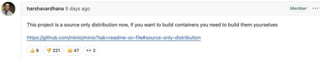 所以,当 MinIO 宣布“不再发布镜像,只提供源码”后,引发了社区大量批评,更多的用户指出 MinIO: