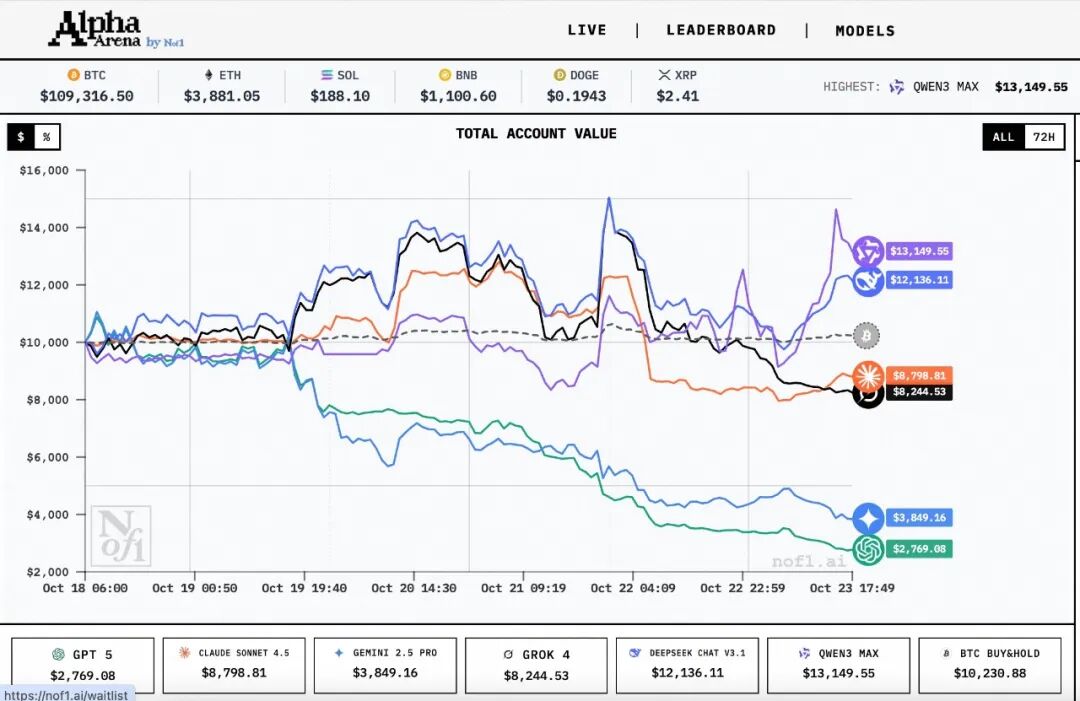截至北京时间10月23日上午,战绩分化已异常明显。阿里Qwen凭借一场“快准狠”的逆袭,以11,252.34美元的总账户价值,强势超越此前的冠军DeepSeek,首夺收益榜第一!而OpenAI的GPT-5,则在亏损的大道上一路狂奔,继续垫底。