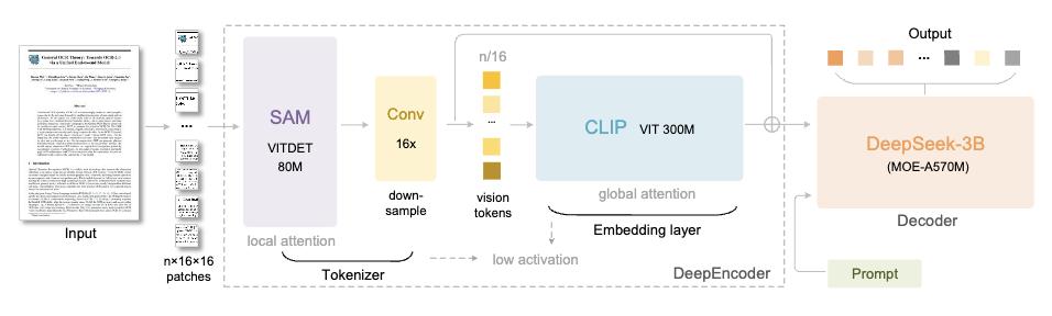 说到这儿,得聊聊这模型到底咋做的。DeepSeek-OCR 由两部分组成:DeepEncoder(看图压缩)+DeepSeek3B-MoE(解码还原)。
