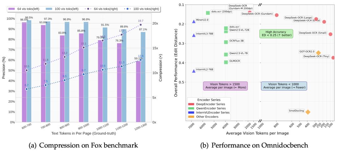 论文里有个特别直观的例子:原本 1000 个 token 才能表达的内容,现在只用 100 个视觉 token 搞定,压缩 10 倍,还能保留 97% 的 OCR 准确率。