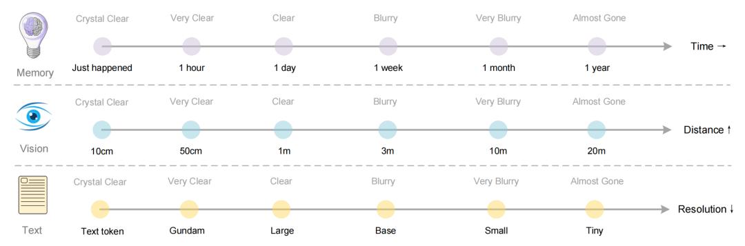 他们设计了一个实验设想:超过第 k 轮的历史对话内容,就渲染成图像;先压一遍,减少 10 倍 token;再久远一点,继续缩小图像尺寸;图像越小,信息越模糊,最终就“忘掉”了。
