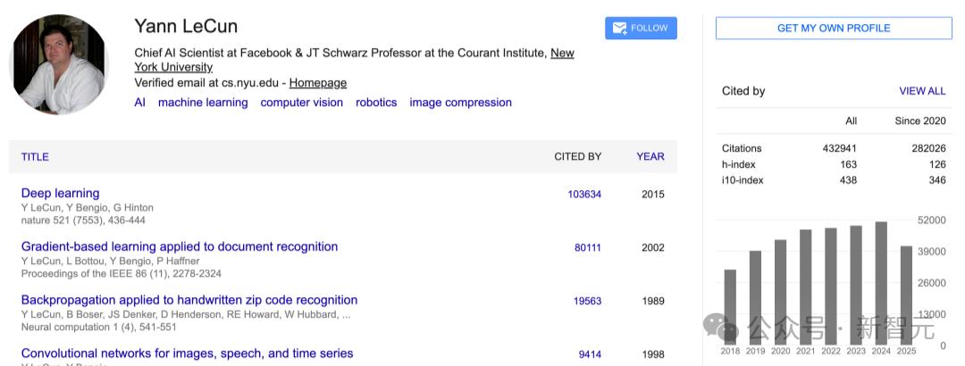 同为图灵奖三巨头的Yann LeCun也有43万+的引用。