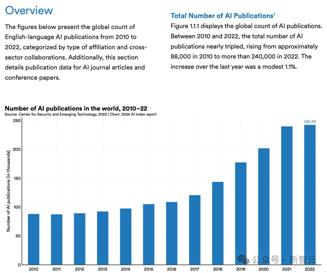 AI Index指出,2010–2022年全球AI论文总量近乎三倍增长(约8.8万→24 万+)。