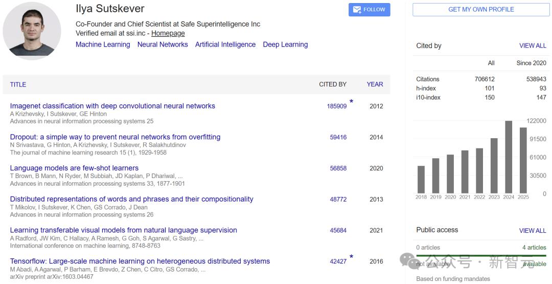 Ilya Sutskever的论文总被引次数超过70万次。