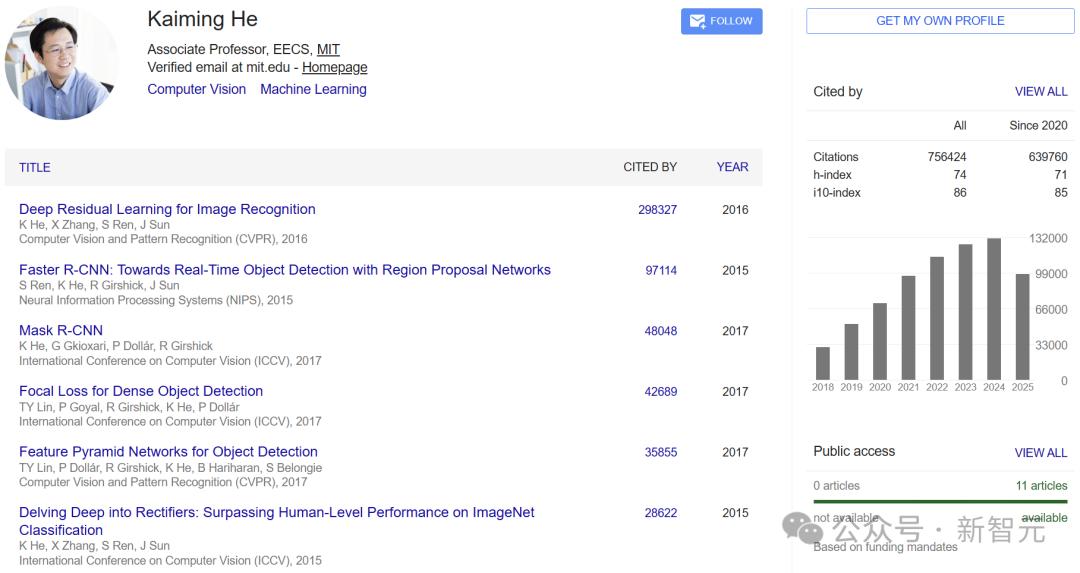 何恺明的论文总被引次数超过75万次。