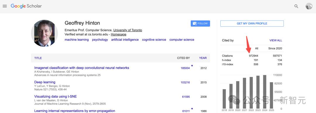 与此同时,人工智能教父辛顿(Geoffrey Hinton)的被引次数也来到97万次!