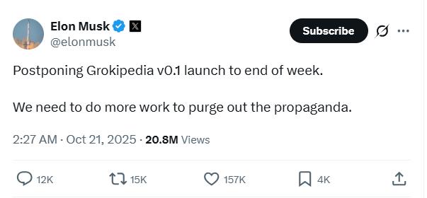 马斯克AI百科上线首日演砸:遭遇宕机、抄袭、造假三连击