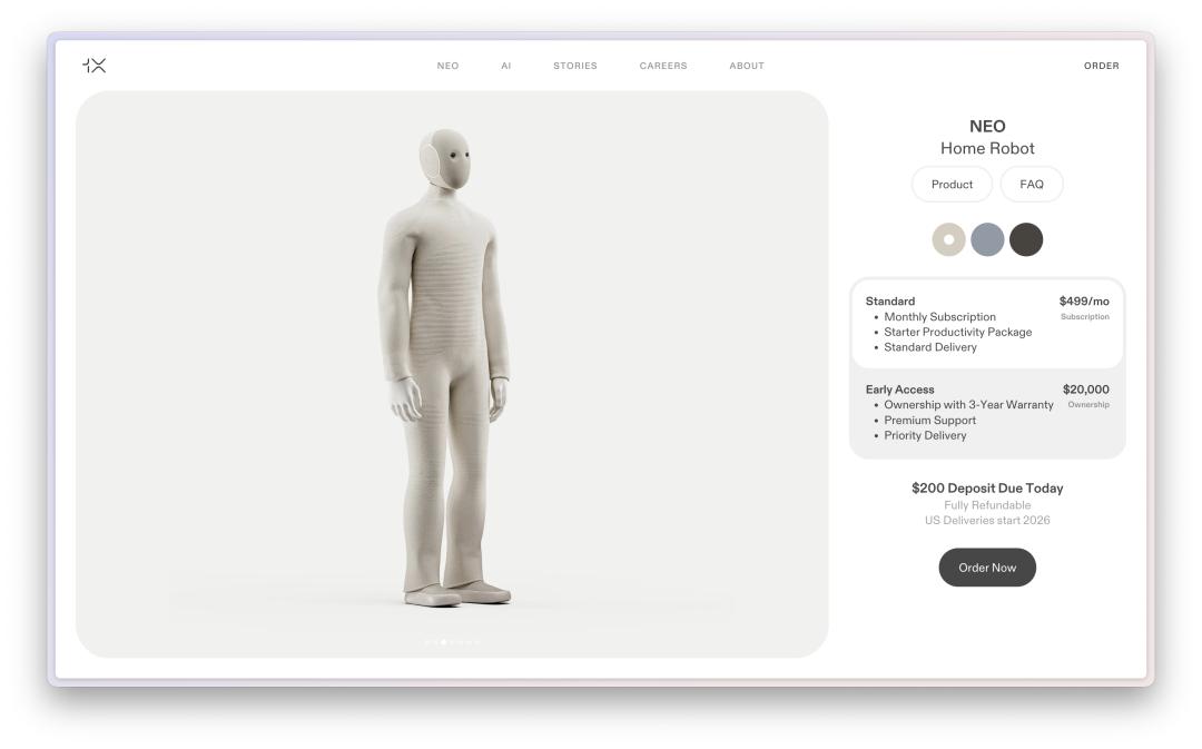 目前已经可以在 1X 官网进行预订,第一批支持美国用户,在明年开始逐一送货;预计 2027 年扩展到全球用户。