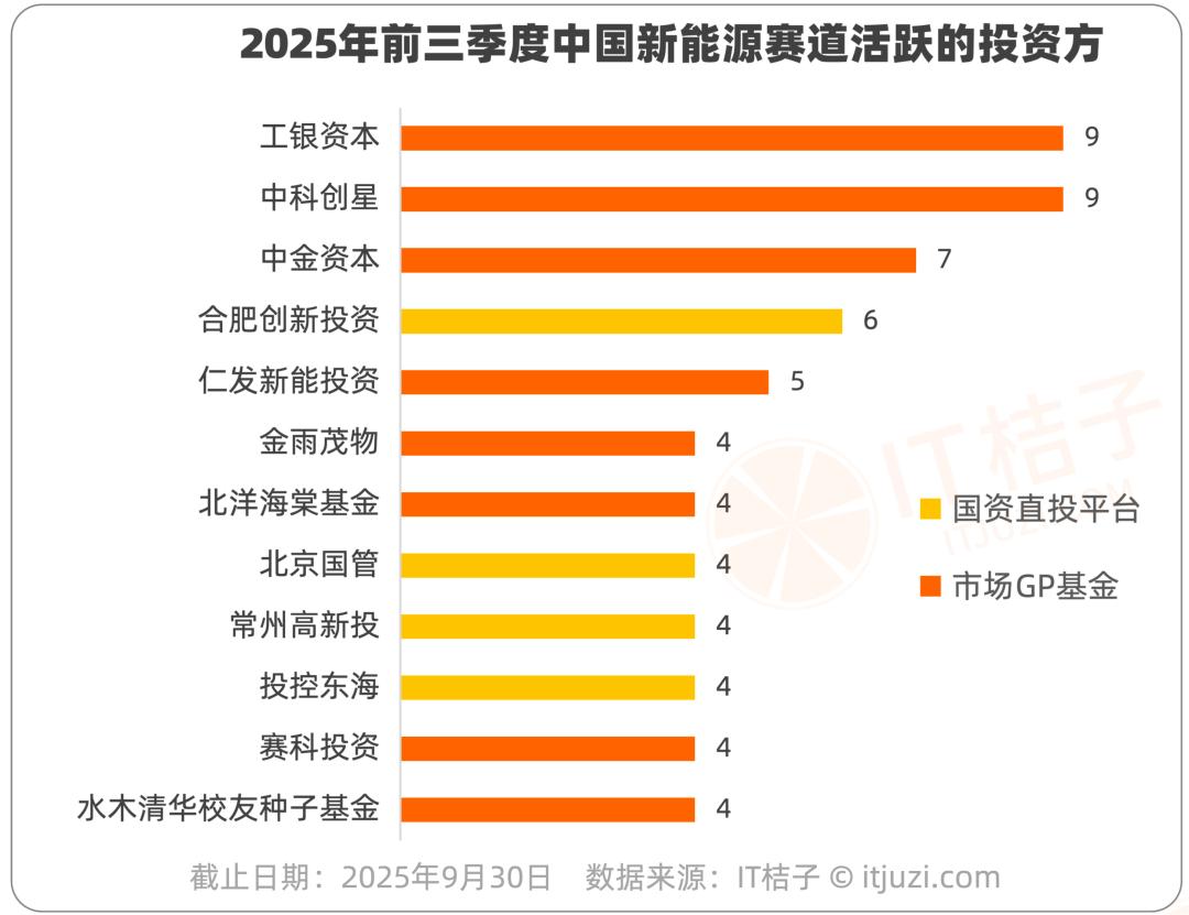 2025年前三季度,国内新能源赛道投资方阵营呈现“市场化 GP 与国资平台协同发力”的态势,两类主体在资金布局上各有侧重。